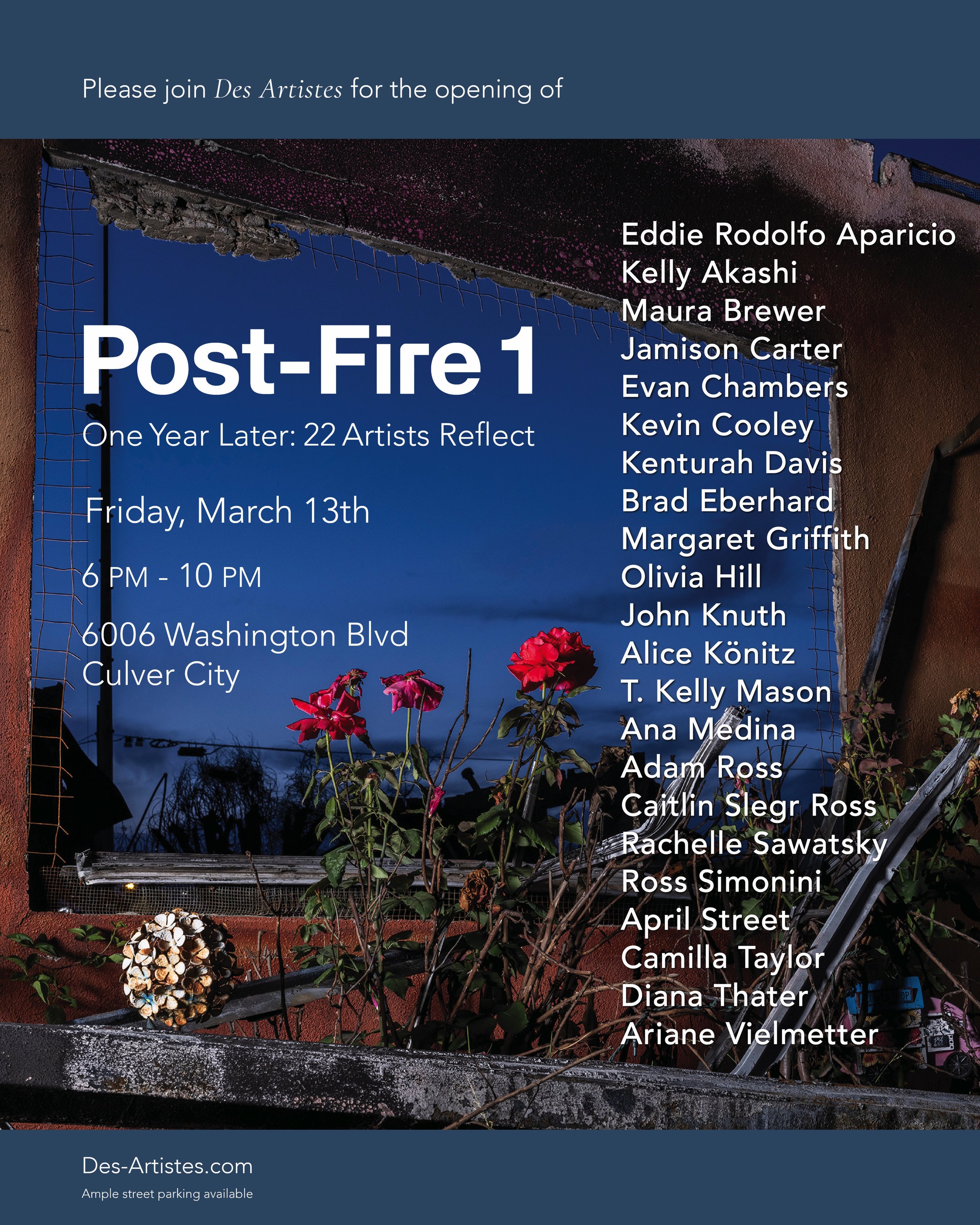 Post-Fire 1 is the first installment of an annual group show, planned for the next 4 years at 6006 Washington Blvd in Culver City. The intent of the Post-Fire series is to showcase and support artists who have experienced the traumatic loss of homes and studios. As a testament to their unbreakable spirit, impacted artists have continued to produce works despite enormous obstacles—taking care of family while grieving, determining how to proceed, replacing equipment and finding a place to create and live, mountains of insurance paperwork, and in some instances, decades of artwork rendered to ash. Post-Fire 1 highlights recent works created by 22 artists from the Altadena area. These works have been made primarily after the devastation of the Eaton fires. Our unifying theme was that artists show what they would like to show—in sculpture, painting, photography and video. All proceeds from sales will go to the artists, with Des Artistes taking no sales commission. Post-Fire 1 launches March 13, 2026 and runs for 10 weeks. It will be open weekly from Wednesday through Sunday, 1 - 6 PM. We will host an artist panel, music event and print release during the run of the exhibit. Post-Fire 1 extends the efforts of the Los Angeles art community, which came together in the wake of the 2025 fires. Much of the work in this show is thanks to generous financial aid, studio spaces, and previous group shows that were created in response to the crisis. The Post-Fire exhibitions look to continue this support into the future, fostering consistent opportunities for affected artists to have a space to showcase the development of their practices.